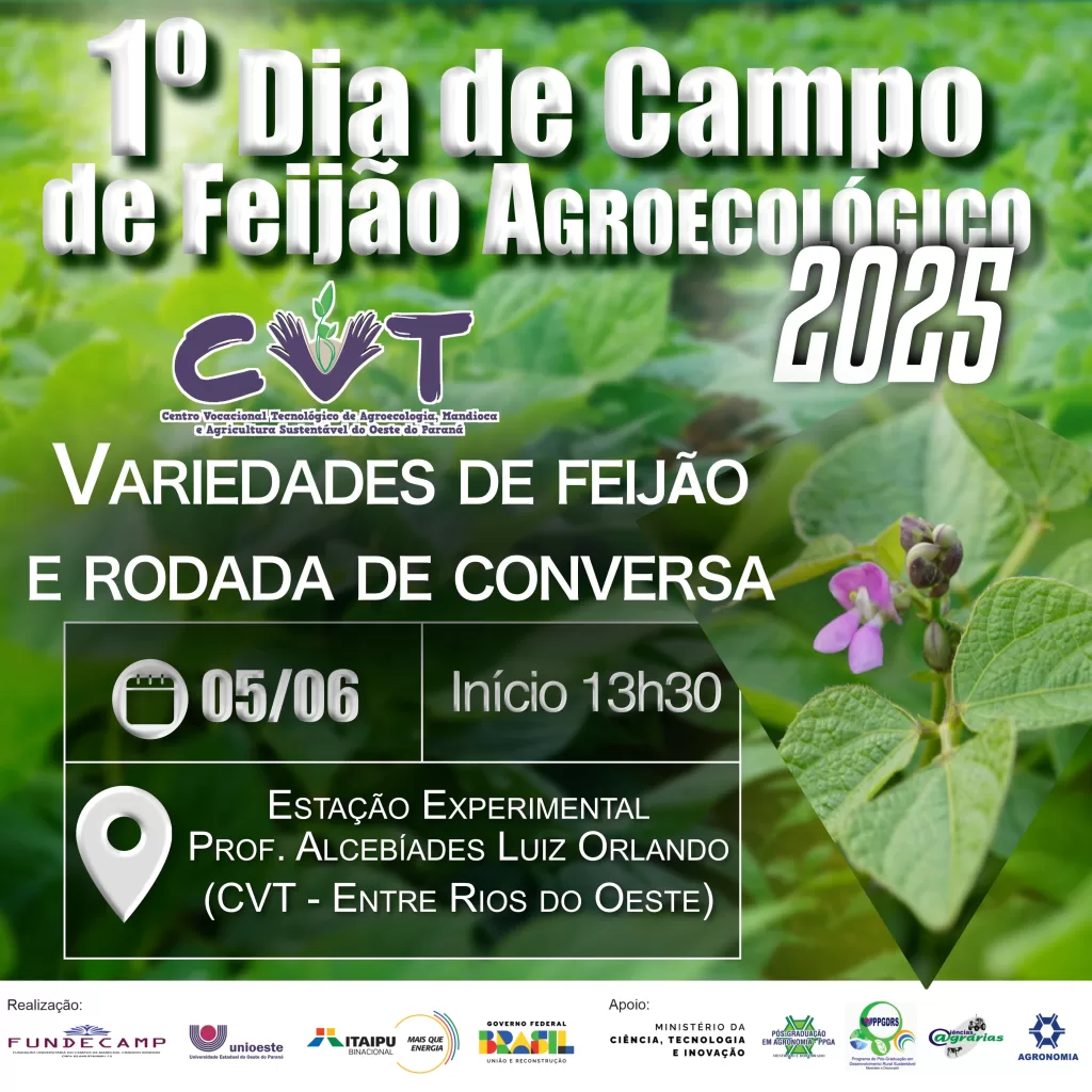 No dia 5 de junho, o município de Entre Rios do Oeste (PR) será sede do 1º Dia de Campo de Feijão Agroecológico, promovido pelo Centro Vocacional Tecnológico de Agroecologia, Mandioca e Agricultura Sustentável (CVT). O evento acontecerá na Estação Experimental Prof. Alcebíades Luiz Orlando, com início às 13h30, e contará com uma programação técnica voltada à agricultura sustentável e ao fortalecimento da agroecologia na região.