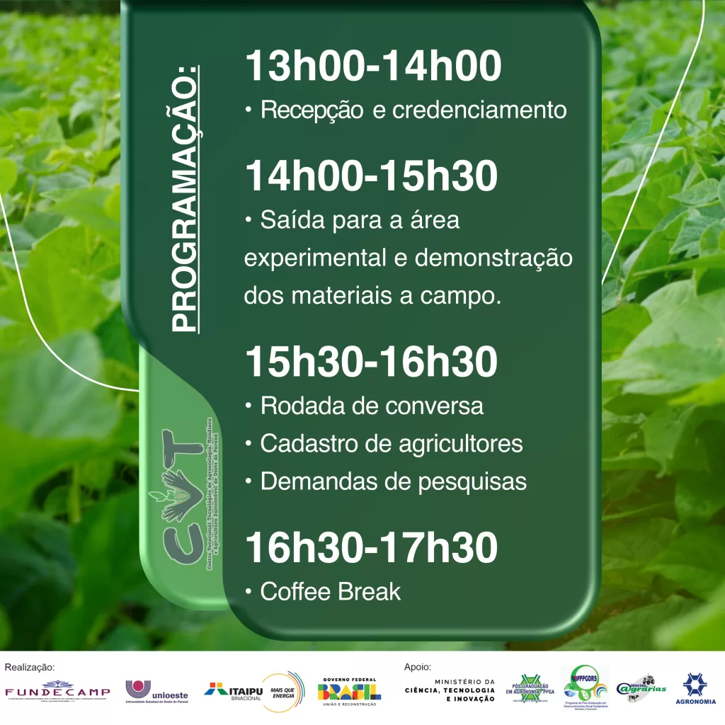O evento é uma realização da Itaipu, Unioeste e Fundecamp e conta com apoio do Ministério da Ciência Tecnologia e Inovação, Programa de Pós-graduação em Agronomia, Programa de Pós-graduação em Desenvolvimento Rural Sustentável, Centro de Ciências Agrárias e curso de Agronomia.