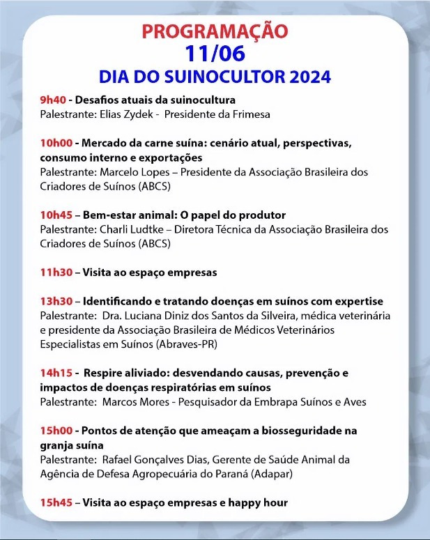 O evento reúne os principais especialistas em avicultura e suinocultura, oferecendo uma programação específica destinada a promover conhecimento e inovação nesses setores essenciais para o agronegócio brasileiro.