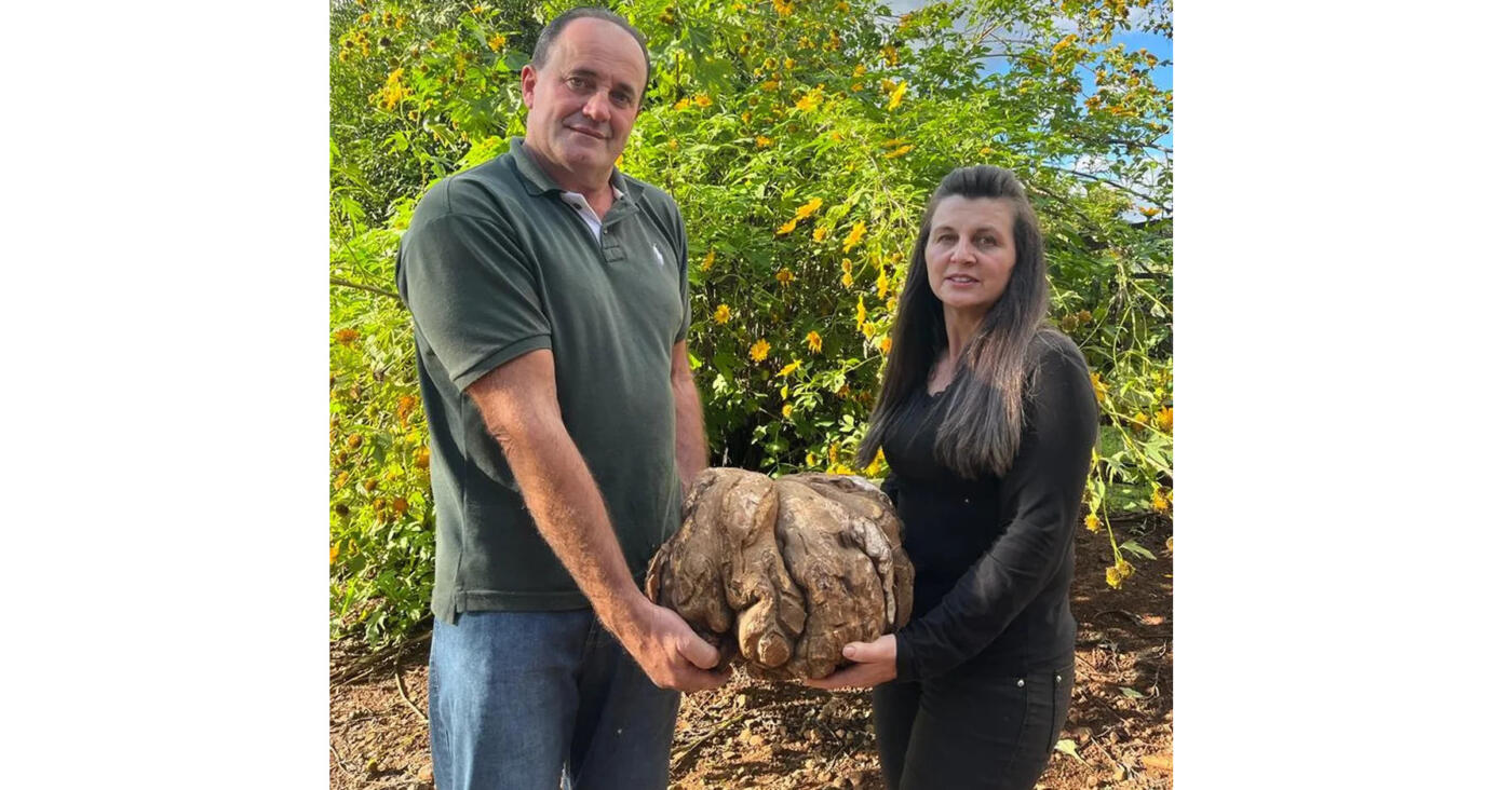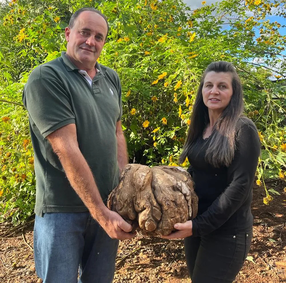 Casados há 29 anos e trabalhando na lavoura em Linha Barra Verde, zona rural de Coronel Vivida, o casal de agricultores, Rosmari Rios Bellei e Joelsom Roque Bellei, foi surpreendido com um tubérculo de tamanho incomum: uma batata doce de 20 quilos.