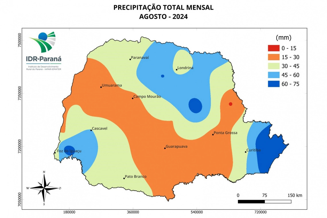 A precipitação foi um pouco maior no Litoral, Norte e em partes das regiões Oeste e da Região Metropolitana de Curitiba (RMC), variando entre 45 e 77 milímetros, mas ainda assim considerada baixa. Nas demais áreas do Estado, o total acumulado não ultrapassou 41 milímetros. O maior volume de precipitação mensal foi registrado em Guaraqueçaba, no Litoral, com 77 milímetros, enquanto o menor índice foi de apenas 7,2 mm, em Ubiratã, no Oeste do Estado.
