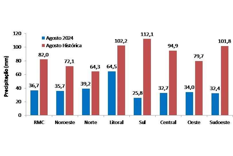 Segundo o boletim, as precipitação em todo o Estado foram significativamente inferiores à média histórica. O Sudoeste e o Sul registraram os menores acumulados de chuva, com déficits de 86,4 milímetros e 69,3 milímetros, respectivamente. O Litoral, embora tenha sido a região menos afetada pela seca, também apresentou um déficit de 37,7 milímetros. As demais regiões apresentaram condições intermediárias em relação à quantidade de chuva. A média estadual de precipitação foi de 37,6 milímetros, enquanto a média histórica é de 88,6 milímetros.