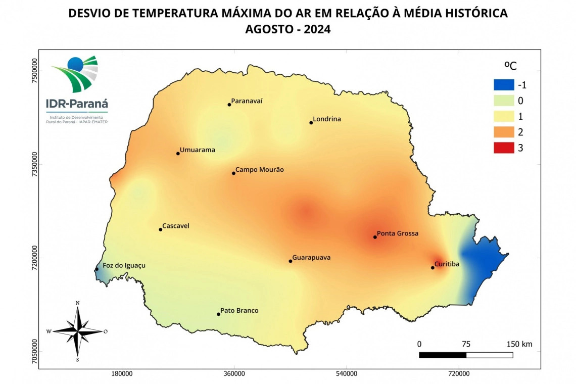 De maneira geral, as temperaturas máximas ficaram acima da média histórica, exceto no Litoral e em uma pequena região no extremo oeste paranaense. No Litoral, por exemplo, a temperatura máxima foi 1 °C abaixo da média histórica. Por outro lado, as demais regiões apresentaram temperaturas entre 1º a 3º C acima da média histórica. A maior temperatura máxima média de agosto foi de 29,1°C, em Cambará, no Norte do Estado. Enquanto que a menor temperatura máxima média ocorreu em Palmas e foi de 19,4 °C.