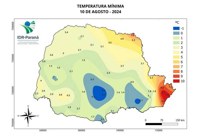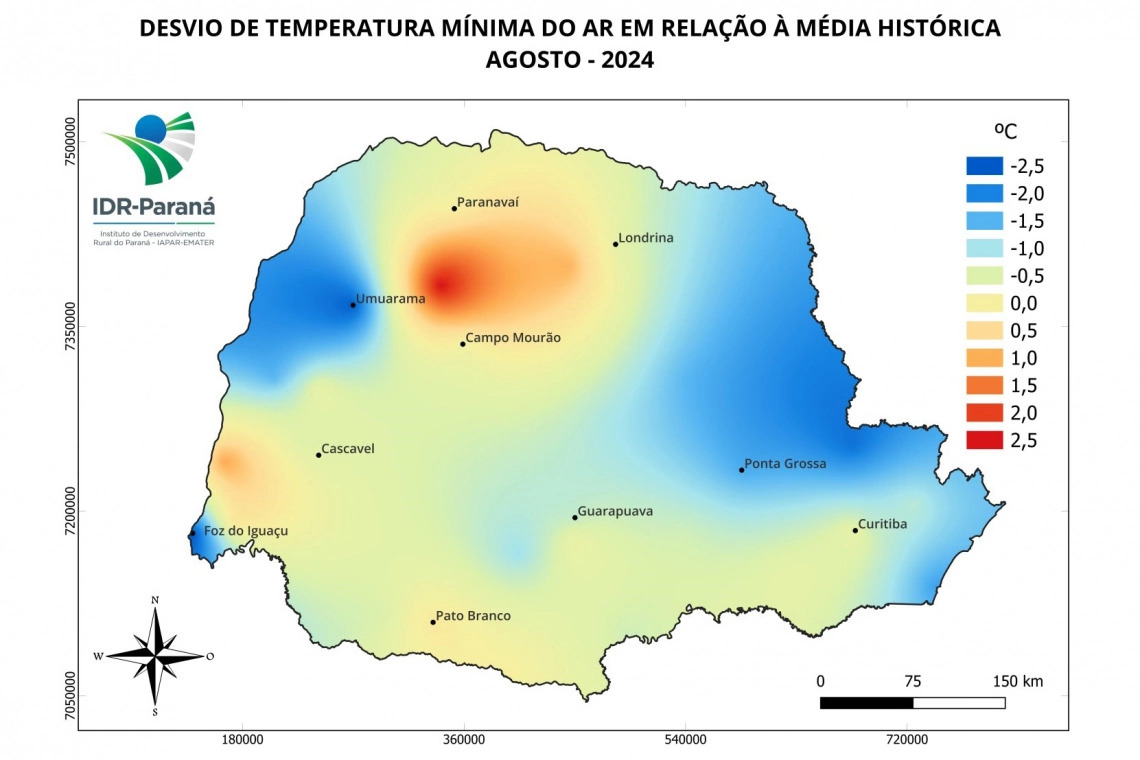 Em agosto, ocorreram duas incursões de massas polares que provocaram geadas em grande parte do Estado, variando de fortes a fracas dependendo do local. A primeira onda de frio foi menos intensa e se deu entre os dias 9 e 14, enquanto a segunda ocorreu de 25 a 29 de agosto e foi bem intensa, especialmente no Sul do Paraná. A temperatura mais baixa registrada foi de -2,7 °C no dia 26, no município de Pinhão, na região Central do Estado.