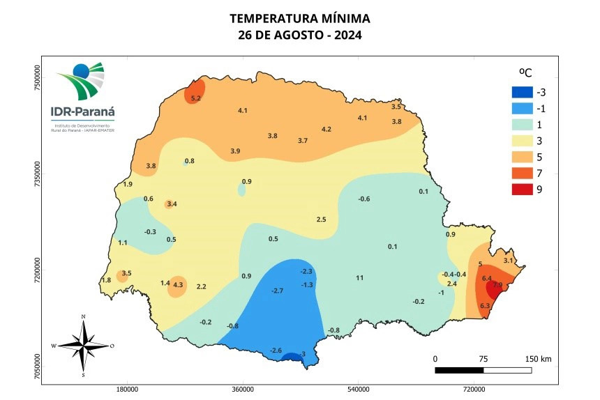 Em Jaguariaíva, no Norte do Estado, a média das temperaturas mínimas foi de 7,2 °C, a menor do Estado. Em Loanda, no Noroeste, a temperatura mínima média foi de 16,3 °C, a mais alta registrada. Em relação à média histórica, as temperaturas mínimas apresentaram desvios de -2,5º C graus e as máximas +2,5 °C.