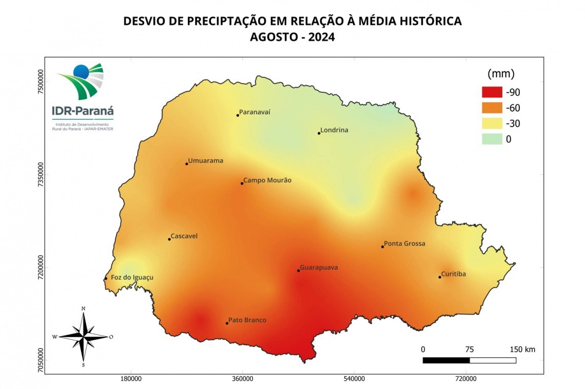 Agosto foi um mês bastante seco no Paraná. Em geral, o cenário agrícola do Paraná em agosto foi desfavorável devido a condições climáticas adversas, como secas e geadas. O clima seco favoreceu o aumento da incidência de focos de incêndio na zona rural do Estado. Os dados são do Boletim Agrometeorológico elaborado pelo do Instituto de Desenvolvimento Rural do Paraná (IDR-Paraná) e técnicos do Departamento de Economia Rural da Secretaria da Agricultura e do Abastecimento (Seab), com apoio do Simepar.