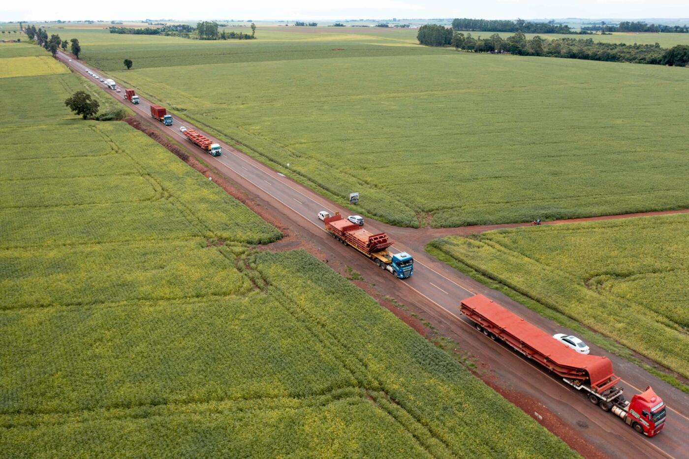 As peças mais leves do comboio pesam 26 toneladas e o equipamento mais pesado é um evaporador de 43 toneladas. Outra carreta veio de São Paulo. Com esse comboio, sobe para 11 o número de carretas com peças e equipamentos de grande porte que já chegaram à esmagadora. No total, a C.Vale vai receber 38 carretas com componentes da indústria na qual está investindo em torno de R$ 1 bilhão.