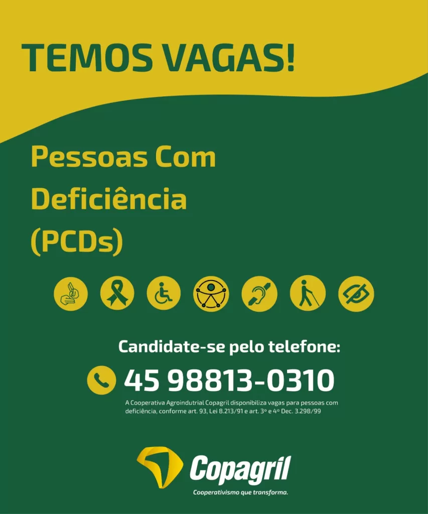 A Cooperativa Agroindustrial Copagril está com vagas abertas para Pessoas com Deficiência (PCD). As oportunidades são para atuação em diferentes áreas, sendo: administrativas, operacionais, comerciais e técnicas, distribuídas em diversas unidades nos estados do Paraná e Mato Grosso do Sul.
