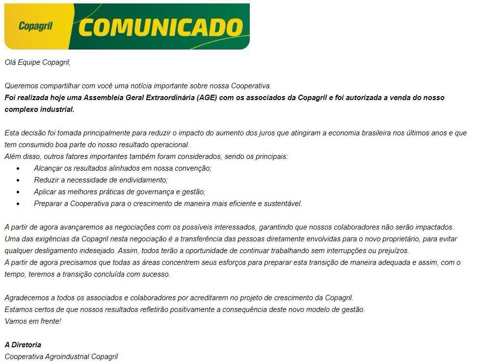Após a assembleia, a Copagril emitiu um comunicado oficial. Confira!