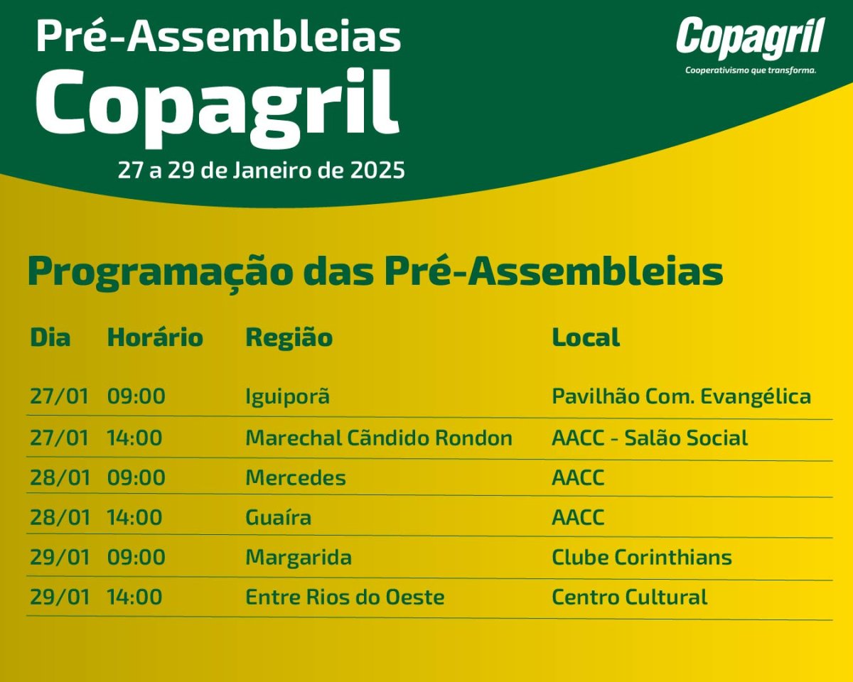 Entre os dias 27 e 29 de janeiro de 2025 serão realizadas as pré-assembleias em seis localidades, na área de abrangência da Copagril, com o objetivo de envolver os associados no processo de planejamento e decisões estratégicas.