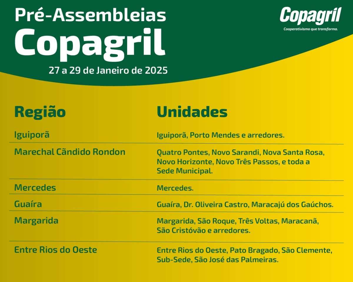 A Cooperativa Agroindustrial Copagril convoca todos os seus associados para participarem das pré-assembleias e da Assembleia Geral Ordinária (AGO) de 2025.