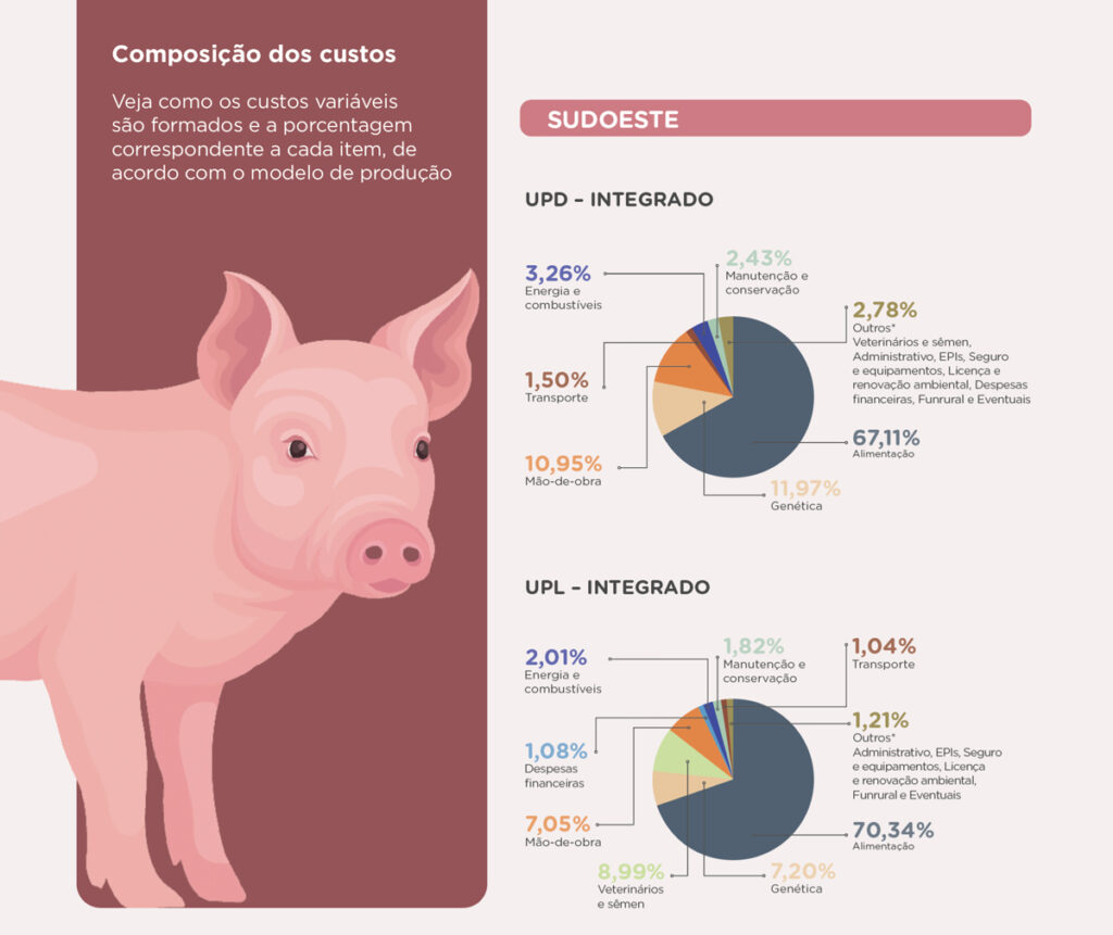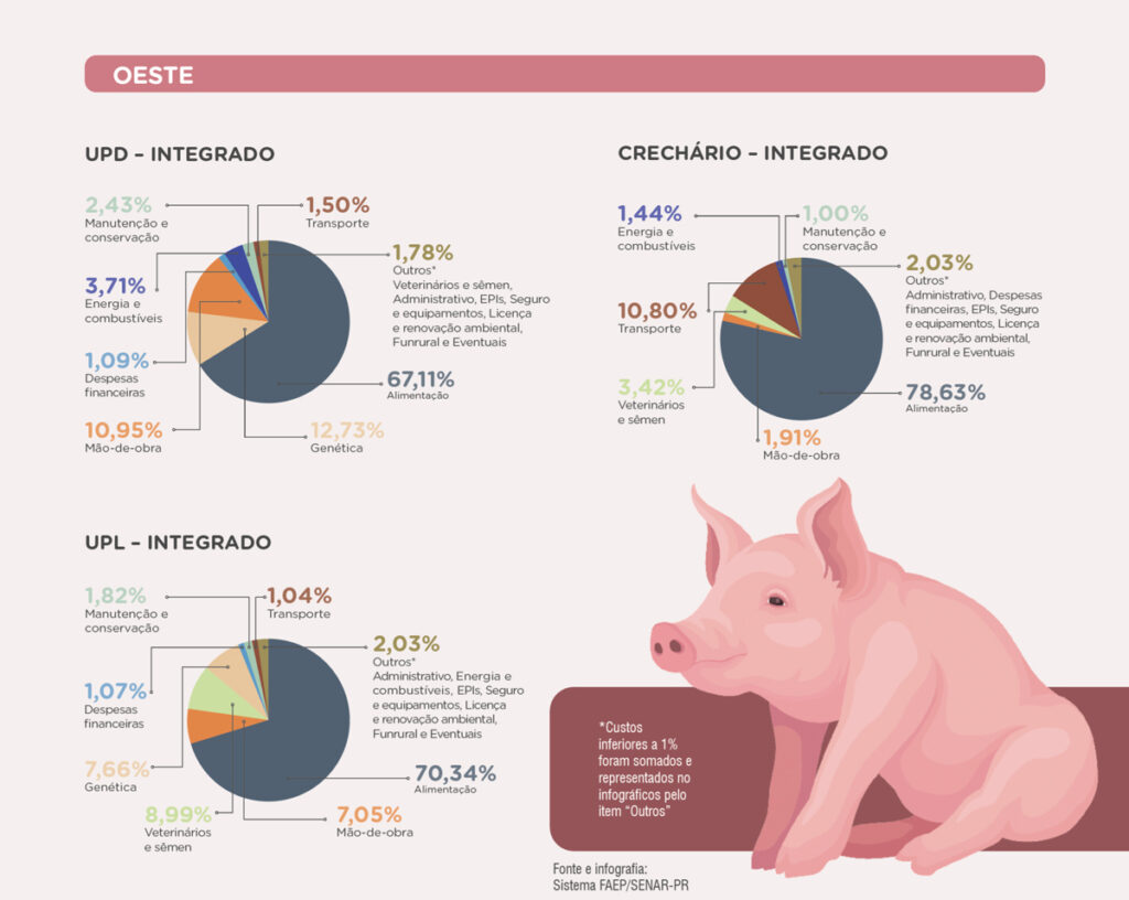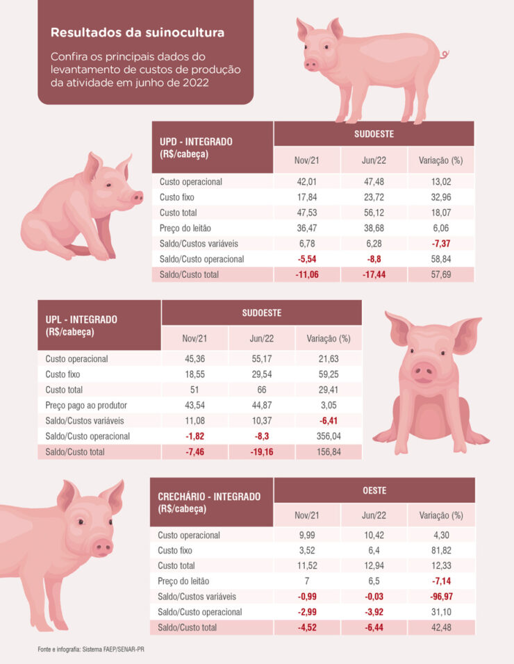 Os aspectos globais e nacionais apontados pela presidente da CT respingam no dia a dia do produtor. Segundo o levantamento do Sistema FAEP/SENAR-PR, donos de Unidade Produtora de Leitões (UPL integrado), por exemplo, tiveram um aumento significativo nos custos de produção em relação ao levantamento anterior, de novembro de 2021. O custo total por cabeça alcançou R$ 66,04, enquanto a receita do produtor foi de R$ 46,87 – prejuízo de R$ 19,17 por leitão.