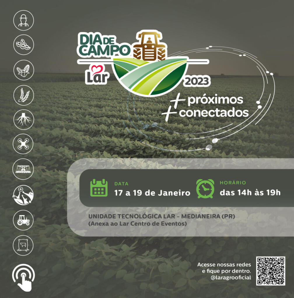 Os preparativos para o Dia de Campo Lar 2023 já tiveram início. O evento acontecerá de 17 a 19 de janeiro na Unidade Tecnológica Lar, anexa ao Lar Centro de Eventos, em Medianeira (PR). Com o tema “mais próximos, mais conectados”, a equipe técnica da Cooperativa e seus parceiros apresentarão assuntos importantes para a agricultura regional, oportunizando contato entre os produtores, fornecedores e os aproximando das novidades e tecnologias do campo.