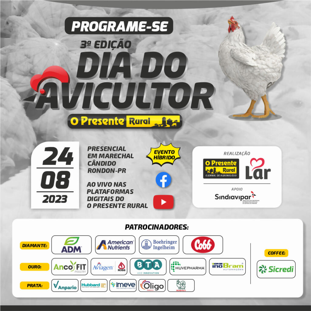 Realizado pelo Jornal O Presente Rural, em parceria com a Lar e o Sindiavipar, o 3º Dia do Avicultor conta com patrocínio diamante ADM, American Nutrients, Boehringer Ingelheim e Cobb; ouro AncoFit, Aviagen, BTA, Huverpharma e Inobram; prata Anpario, Hubbard, Imeve, Oligo e Suiaves. E o coffee break terá patrocínio exclusivo da Sicredi Aliança PR/SP.