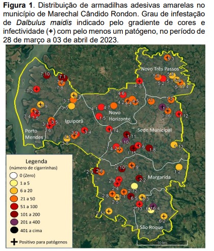Quanto à população de cigarrinhas, todas as armadilhas distribuídas no município de Marechal Cândido Rondon capturaram cigarrinhas do milho, que contabilizaram um total de 4250 cigarrinhas, sendo que 2 armadilhas (2,9%) capturaram até 5 cigarrinhas (pontos cor amarela); 14 armadilhas (20,6%) de 6 a 20 cigarrinhas (pontos cor laranja claro), 20 armadilhas (29,4%) capturam entre 21 e 50 cigarrinhas (pontos cor laranja escuro), 19 armadilhas (27,9%) capturaram entre 51 e 100 cigarrinhas (pontos cor vermelho claro), 10 armadilhas (14,7%) capturaram entre 101 e 200 cigarrinhas (pontos cor vermelho escuro) e 3 armadilhas (4,4%) capturaram entre 201 e 400 cigarrinhas (pontos cor roxa).