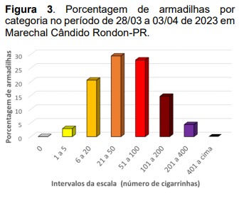 A Figura 3 mostra a quantidade de armadilhas por categoria e em relação à leitura anterior, as armadilhas contendo de 51 a 100 cigarrinhas (cor vermelho claro) permaneceu estável em relação a última leitura e a faixa de 101 a 200 cigarrinhas (cor vermelho escura) apresentou crescimento de 5,2%, contudo o número de armadilhas na faixa de 201 a 400 cigarrinhas (cor roxa) saltou de uma para 3 armadilhas. Essa situação mantém o avermelhamento do mapa (Figura 1), mas com evolução para alguns pontos roxos.