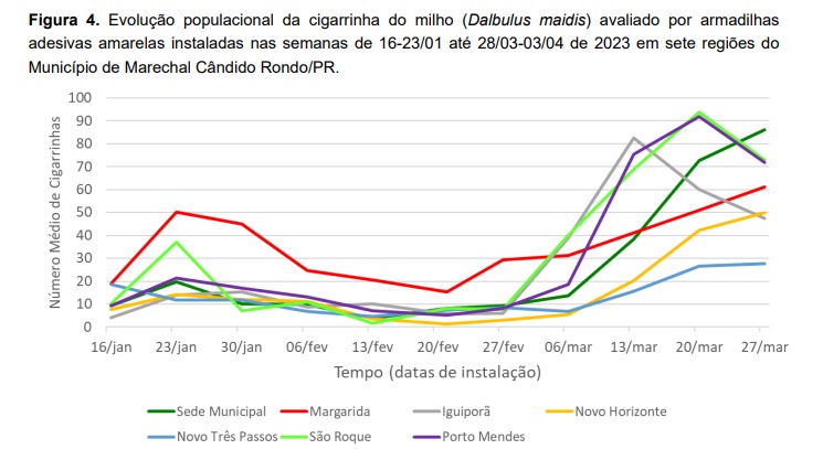 Na primeira quinzena de março os distritos de Iguiporã, São Roque e Porto Mendes vivenciaram uma explosão populacional ocasionada possivelmente pela migração das cigarrinhas (Figura 4), contudo, no momento atual, essas populações estão em declínio, possivelmente até estabilizar o nível populacional.