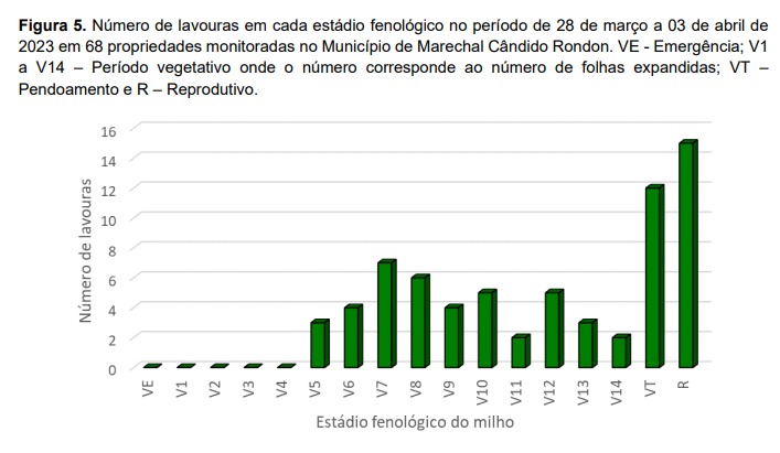 Na décima primeira avaliação da flutuação populacional de cigarrinhas no milho a precipitação pluvial tem sido baixa (média na semana 14,8 milímetros), permitindo que o cartucho do milho esteja isento de água livre e o ambiente propício para multiplicação das cigarrinhas, favorecendo o aumento da população. Nesse momento, 20,6% das propriedades avaliadas estão entre a quinta e a sétima folha expandida (V5- V7), período em que as plantas infectadas pelos molicutes ainda apresentam algum potencial de redução da produtividade, principalmente em cultivares mais sensíveis, sendo importante adotar o manejo recomendado pelo Engenheiro Agrônomo que presta assistência técnica. Por outro lado, 79,4% das lavouras já atingiram ou passaram do estádio de 8 folhas expandidas (V8), estádio no qual poucos danos são registrados pela inoculação de molicutes, ou seja, estão saindo ou saíram da fase de maior risco e, caso não tenham sido contaminadas pelos patógenos, apresentam baixo risco de perda de produtividade nestas fases. A Figura 5 mostra o número de lavoura de milho safrinha monitoradas em cada estádio fenológico da cultura na semana do dia 28 de março a 03 de abril de 2023.