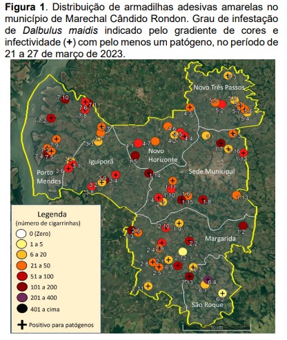 Quanto a população de cigarrinhas, todas as armadilhas capturaram cigarrinhas do milho, que contabilizaram um total de 4260 cigarrinhas, sendo que 2 armadilhas (2,9%) capturaram até 5 cigarrinhas (pontos cor amarela); 16 armadilhas (23,5%) de 6 a 20 cigarrinhas (pontos cor laranja claro), 19 armadilhas (27,9%) capturam entre 21 e 50 cigarrinhas (pontos cor laranja escuro), 19 armadilhas (27,9%) capturaram entre 51 e 100 cigarrinhas (pontos cor vermelho claro), 11 armadilhas (16,2%) capturaram entre 101 e 200 cigarrinhas (pontos cor vermelho escuro) e 1 armadilhas (1,5%) capturaram entre 201 e 400 cigarrinhas (pontos cor roxa).