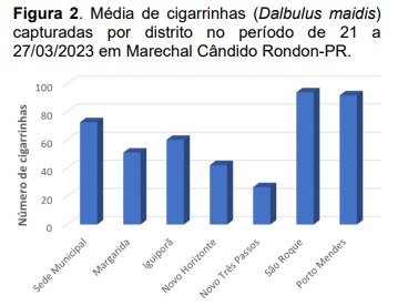 Das nove propriedades em avaliação cinco estão nos estádios de risco, ou seja, lavouras com plantio mais tardio e em intensa fase de aplicação de inseticida, o que pode ter contribuído nessa redução. Na sequência o distrito de Margarida apresentou 51,1 cigarrinhas capturadas por armadilha (aumento de 24,1%), nesse distrito 70% das propriedades avaliadas já passou do estádio V8, mas chegaram nessa fase sempre em contato com cigarrinhas, isso pode indicar danos na produtividade. Por fim, o distrito de Novo Horizonte com número médio de 42,1 cigarrinhas por armadilha, aumento de 107,5% em relação a avaliação anterior, com o crescimento da população ainda em curso e 70% das propriedades avaliadas ainda nas fases de risco, visto que a semeadura foi tardia deve permanecer em alerta para manejo das pragas.