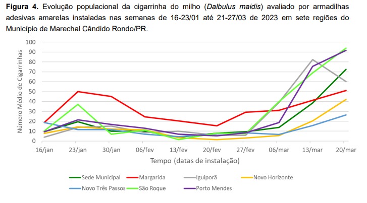 A flutuação populacional da cigarrinha do milho pode ser visualizada na Figura 4, apresentado dados desde o início das avaliações em 16 de janeiro até o momento atual, a qual demostra a explosão populacional ocorrida nas últimas semanas e na Tabela 1 estão os dados das últimas seis semanas do monitoramento para cada ponto (data, número de cigarrinhas e infectividade).