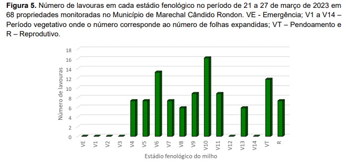 Por outro lado, 64,7% das lavouras já atingiram ou passaram do estádio de 8 folhas expandidas (V8), estádio no qual poucos danos são registrados pela inoculação de molicutes, ou seja, estão saindo ou saíram da fase de maior risco e, caso não tenham sido contaminadas pelos patógenos, apresentam baixo risco de perda de produtividade nestas fases. A Figura 5 mostra o número de lavoura de milho safrinha monitoradas em cada estádio fenológico da cultura na semana do dia 21 a 27 de março de 2023.
