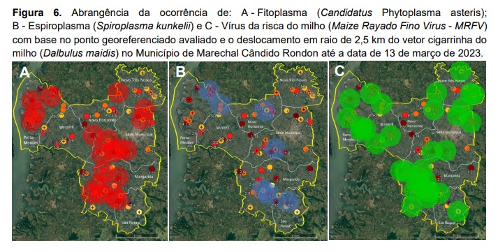 A localização das populações contaminadas com patógenos causadores de enfezamentos e o vírus da risca do milho nas cigarrinhas são apresentados na Figura 6. Para Fitoplasma (A), Espiroplasma (B) e Vírus da risca do milho (C) com base nos pontos amostrados e raio de migração principal de 2,5 quilômetros. Em uma primeira análise, observa-se focos de Fitoplasma nos distritos de Porto Mendes, Margarida e dois focos na sede municipal, um ao Norte e um ao Sul, este último se unindo com o foco do distrito de Margarida e um foco isolado em Novo Horizonte. Quando se observa a presença de Espiroplasma, nota-se que este patógeno não é tão presente quanto Fitoplasma e o vírus da risca, apresentando focos em Porto Mendes, Novo Horizonte, sede municipal e um foco entre os distritos de Margarida e São Roque.