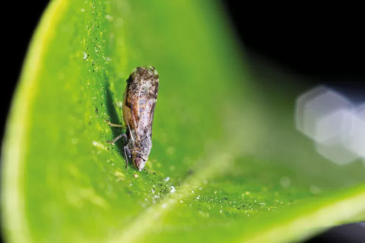 Também conhecido como Huanglongbing (HLB), o greening é causado por uma bactéria, a Candidatus liberibacter. Ela é disseminada pelo psilídeo Diaphorina citri, um inseto milimétrico (mede entre dois e três milímetros), que se alimenta de brotos novos ou da parte de trás das folhas de plantas cítricas. Como é uma doença silenciosa e sem tratamento, quando os sintomas do greening se manifestam, com as folhas amareladas na copa das árvores e frutos manchados, a contaminação já está em um estado irreversível. As árvores deixam de produzir.