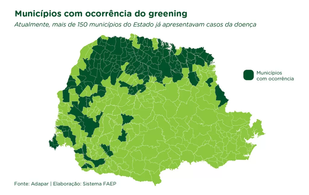 Desde o fim de dezembro de 2023, por decreto do governador Carlos Massa Junior, o Paraná está em estado de emergência fitossanitária, em razão da infestação por HLB. A medida contempla uma série de esforços conjuntos de monitoramento e controle da doença. Segundo o mapeamento da Agência de Defesa Agropecuária do Paraná (Adapar), o greening está presente em pomares de mais de 150 municípios paranaenses. Uma das preocupações é manter a praga restrita às regiões onde ela se encontra hoje e conter o avanço para outras áreas de produção.