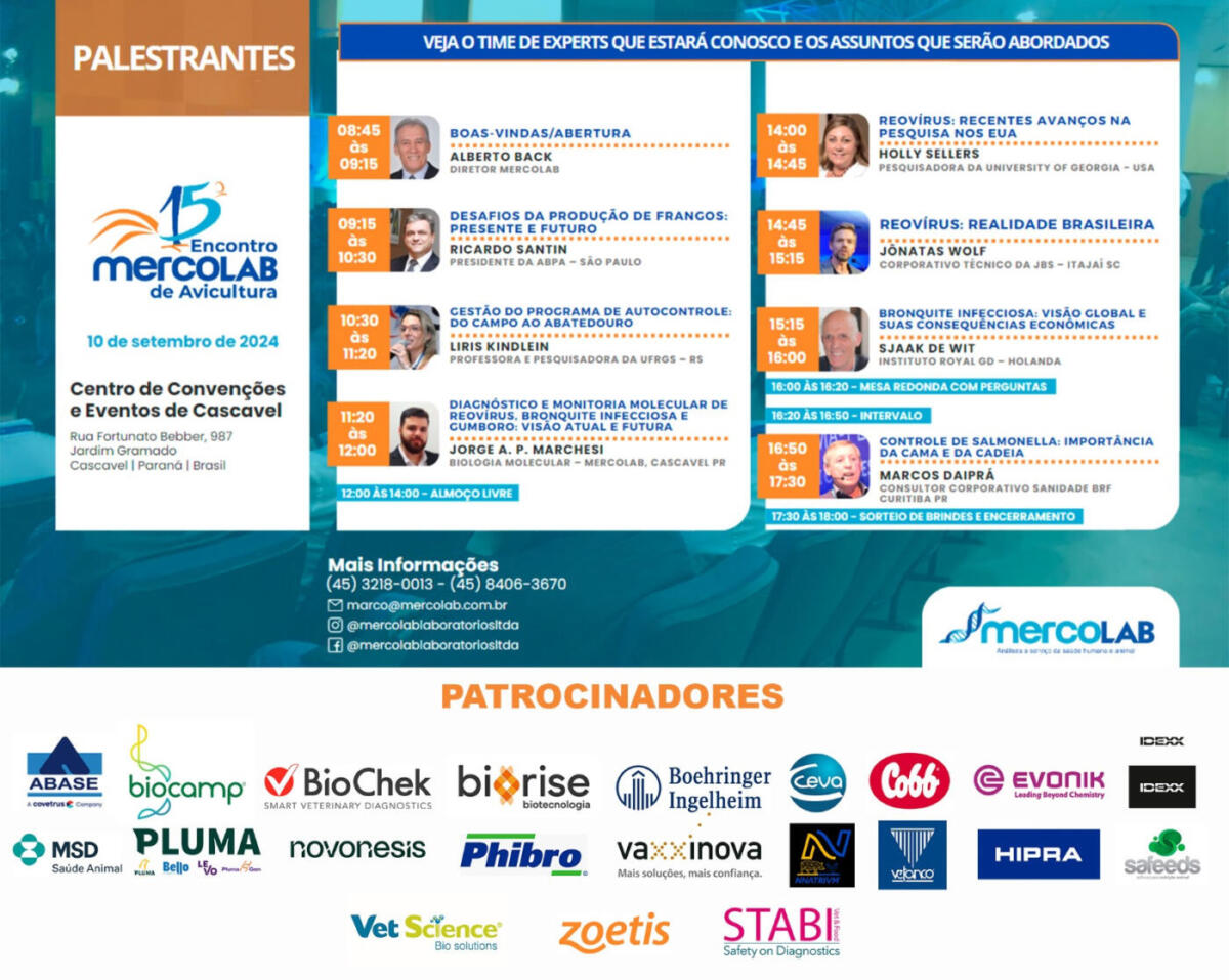 “Contaremos com a participação de grandes especialistas nos mais diferentes assuntos da cadeia da avicultura, focando principalmente em aspectos considerados centrais para a sanidade dos plantéis”, informa o diretor do MercoLab e coordenador do encontro, o médico veterinário Alberto Back. Além de contribuir para a atualização de conteúdos, o Encontro permite unificar acesso a informações estratégicas para a prevenção de doenças avícolas capazes de impor restrições sanitárias severas ao Brasil e provocar prejuízos incalculáveis aos produtores e à economia.