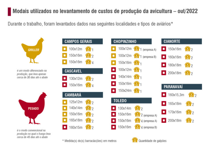 Nos levantamentos deste ano foram acompanhados 29 diferentes modais, referentes ao número dos aviários, dimensões dos galpões, empresa integradora e tipo de frango alojado (griller ou pesado). Esses modelos são os que mais se repetem e correspondem ao perfil das propriedades no Paraná. A pesquisa aconteceu com produtores rurais, representantes da agroindústria, revendedores de insumos e demais agentes do setor nas principais regiões produtoras de frango de corte: Campos Gerais, Cambará, Paranavaí, Cianorte, Cascavel, Toledo e Chopinzinho. Nos encontros, os participantes levam suas contas de luz, notas de compra de insumos, holerite e outros dados para subsidiar o levantamento.