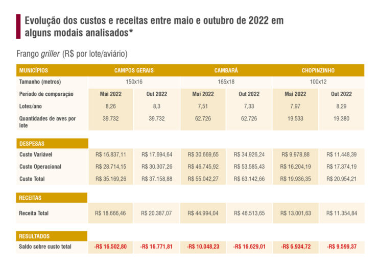 Uma das questões observadas no levantamento de outubro é os ganhos de escala possíveis na atividade. Em Cambará, por exemplo, nos aviários de 150 metros X 16 metros e 165 metros X 18 metros, a receita cobriu apenas os custos variáveis. Já nos aviários menores, de 125 metros X 12 metros e 140 metros X 14 metros, a receita foi insuficiente para cobrir os desembolsos para produzir o lote.