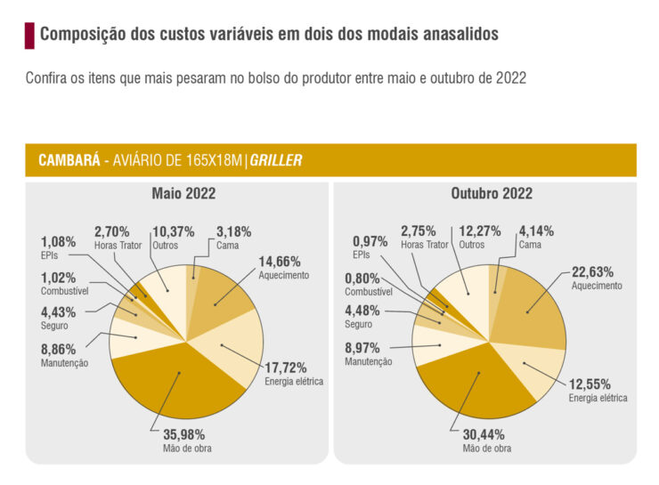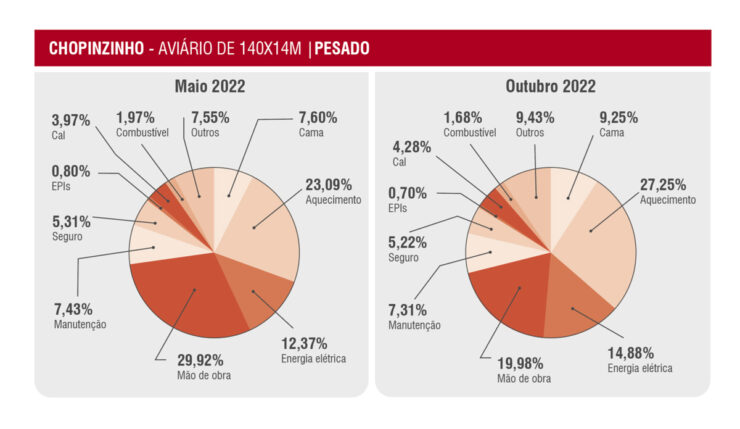 Na região de Toledo, por exemplo, o aumento de custos com aquecimento registrado no modal composto por quatro barracões de 150x16m, entre maio e outubro desse ano, foi de 275%. Nesse caso, a participação da lenha e/ou pellets nos custos de produção, que era de 26,8% em maio, passou para 41,7% em outubro.