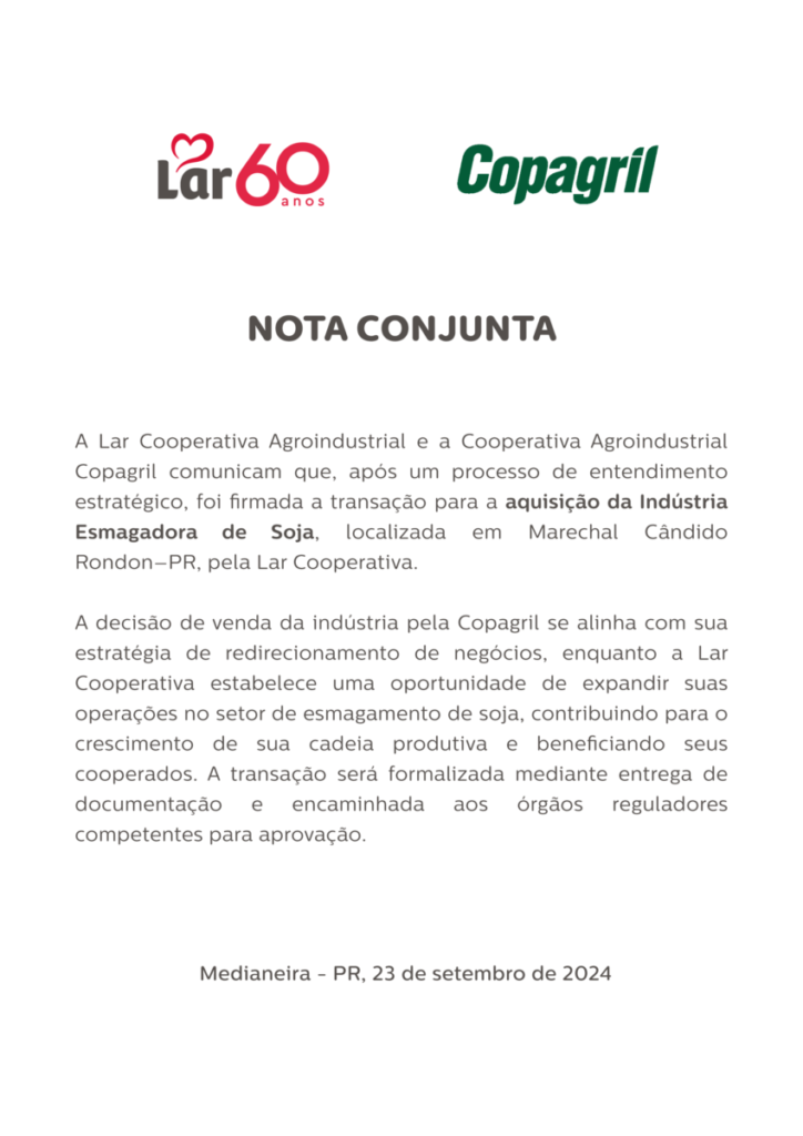A Lar Cooperativa Agroindustrial e a Cooperativa Agroindustrial Copagril divulgaram uma nota conjunta, na segunda-feira (23), sobre a aquisição pela Lar da indústria esmagadora de soja localizada em Marechal Cândido Rondon.