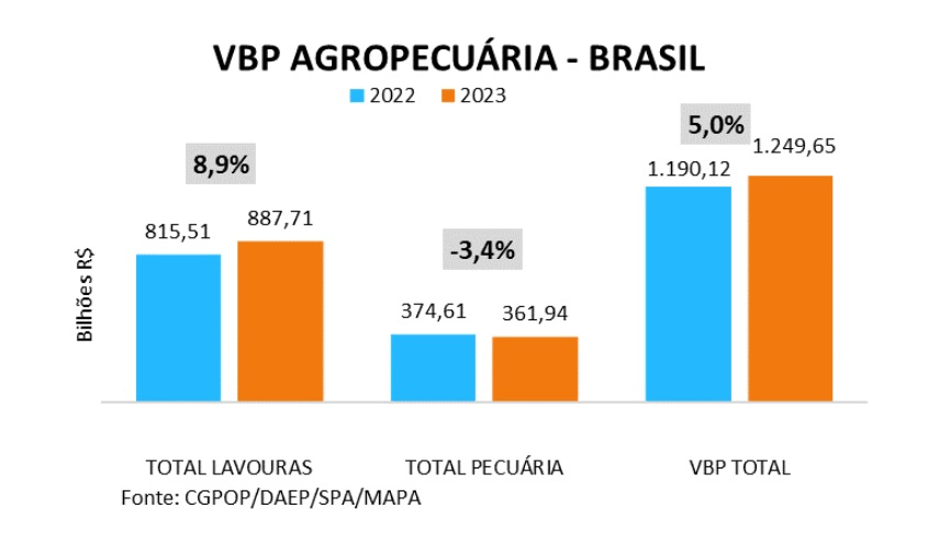 O Valor Bruto da Produção Agropecuária (VBP) de 2023 está estimado em R$ 1,249 trilhão, valor 5 % maior do que o obtido no ano passado. De acordo com o Ministério da Agricultura e Pecuária (Mapa), esse é o maior resultado da série iniciada há 34 anos.