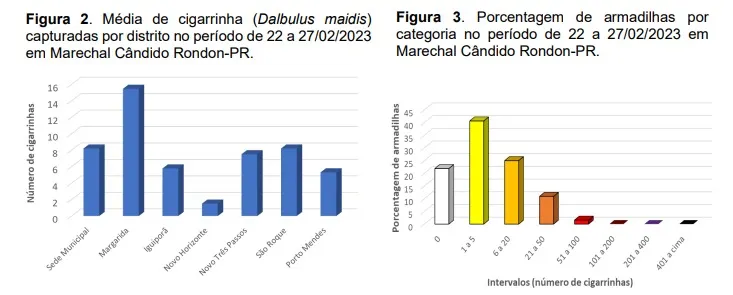 O Boletim Técnico nº6 – Alerta Cigarrinha, divulgado na sexta-feira (03), mostra que a maior proporção de cigarrinhas contaminadas por ponto de avaliação se concentra na sede de Marechal Cândido Rondon (PR) e nos distritos de São Roque, Porto Mendes e Margarida – que apresenta a maior média de insetos capturados. O distrito de Novo Horizonte teve no período de avalição a menor taxa – 1,5 cigarrinhas capturadas por armadilha.