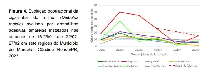 Na Figura 4 pode-se visualizar a flutuação populacional desde o início das avaliações em 16 de janeiro, com ajuste da flutuação no Distrito de Margarida conforme avaliações dos períodos de 06 a 12 de fevereiro e 21 a 27 de fevereiro (linha vermelha tracejada na Figura 4).