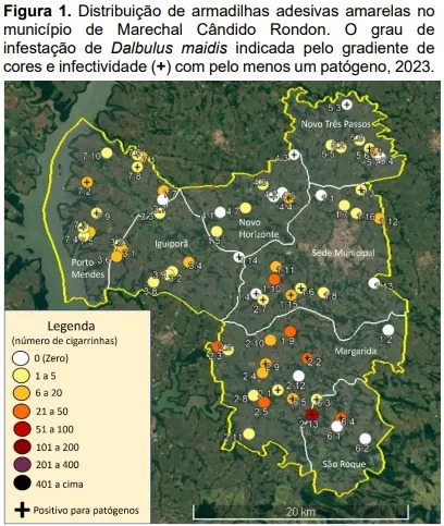 Quanto à população de cigarrinhas, 14 (21,9%) das armadilhas não capturaram cigarrinhas do milho (cor branca no mapa) e 50 pontos registraram a presença do inseto nas armadilhas, que contabilizaram um total de 508 cigarrinhas, sendo que 26 armadilhas (40,6%) capturaram até cinco cigarrinhas (pontos cor amarela); 16 armadilhas (25%) de seis a 20 cigarrinhas (pontos cor laranja claro), sete armadilhas (10,9%) capturam entre 21 e 50 cigarrinhas (pontos cor laranja escuro) e uma armadilha (1,6%) capturou entre 51 e 100 cigarrinhas (pontos cor vermelho claro). Quatro armadilhas foram perdidas pela condição de forte chuvas e vento.