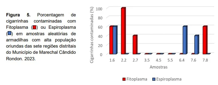 Quanto à presença de molicutes (Fitoplasma e Espiroplasma) circulantes nas cigarrinhas, em amostragem aleatória de 10 pontos de avaliação na Sede Municipal e nas seis regiões distritais coletadas no período entre 31 de janeiro e 6 de fevereiro (Figura 5) observou-se a proporção de cigarrinhas contaminadas por amostra.