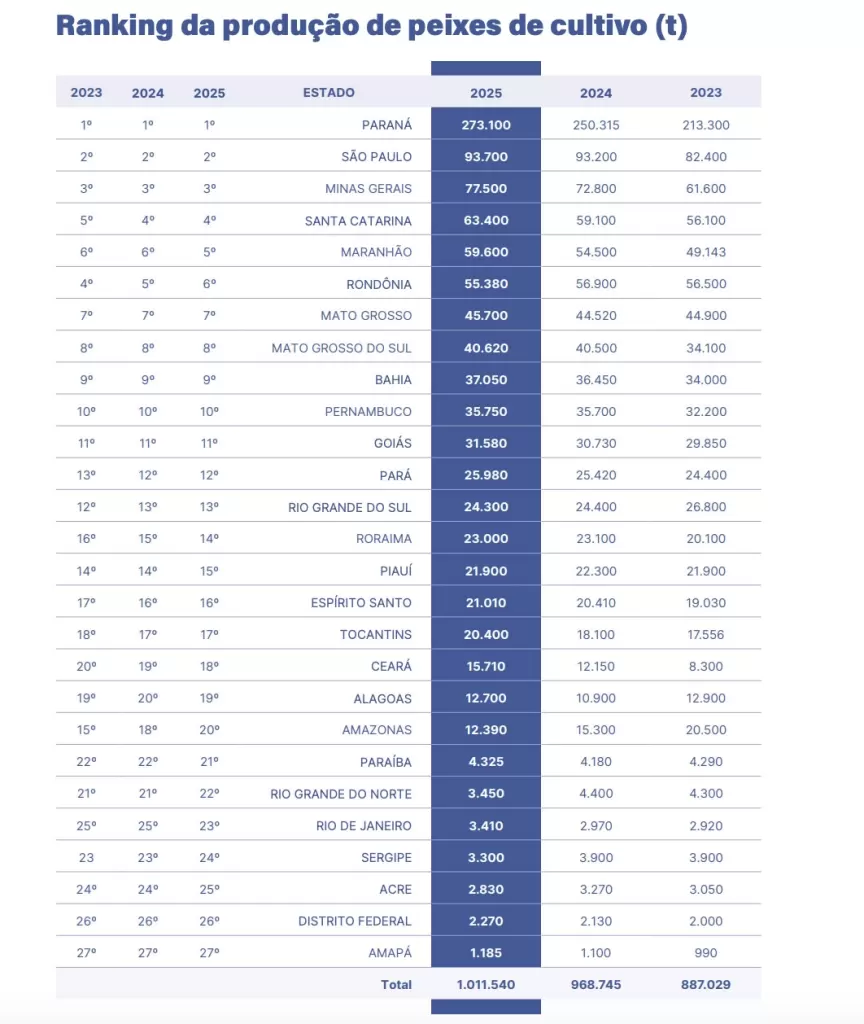 Pela primeira vez o Brasil alcançou a marca de 1 milhão de toneladas produzidas (1.011.540 t). O resultado do cultivo de pescados cresceu 4,41% no Brasil, se comparado ao volume produzido em 2024. Nos últimos 10 anos, a atividade brasileira cresceu 58,6%.