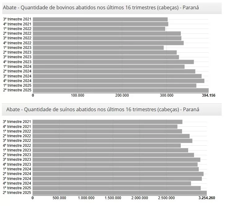 No abate de suínos, o Paraná registrou um aumento de 60,09 mil cabeças em relação ao 1º trimestre, atingindo um novo recorde de 3,25 milhões de unidades, o maior volume para três meses da série histórica. Com esse desempenho, o Estado manteve-se na vice-liderança nacional, sendo responsável por 21,7% da produção brasileira, atrás apenas de Santa Catarina, que responde por 28%.