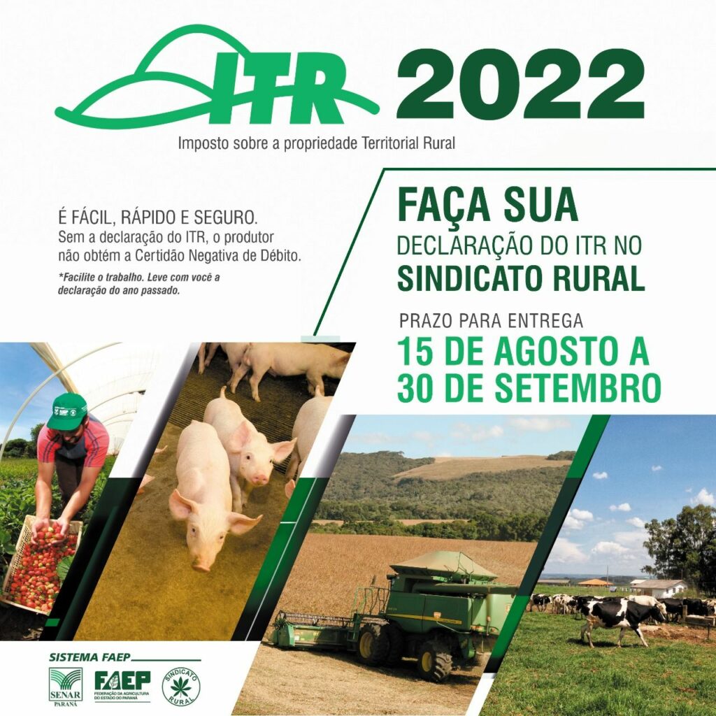 O prazo para entrega da declaração do Imposto Territorial Rural (ITR), referente ao exercício 2022, começa no dia 15 de agosto e termina em 30 de setembro. O procedimento é obrigatório para pessoas físicas e/ou jurídicas proprietárias, titulares do domínio útil ou possuidoras de qualquer título de imóvel rural, inclusive a usufrutuária. A declaração deve ser feita de forma online, por meio por intermédio do programa ITR/2022, disponível no site da Secretaria Especial da Receita Federal do Brasil (RFB) (Clique aqui). Todas as informações e orientações constam na Instrução Normativa RFB 2.095/2022, publicada no Diário Oficial da União (DOU) no dia 26 de julho deste ano.