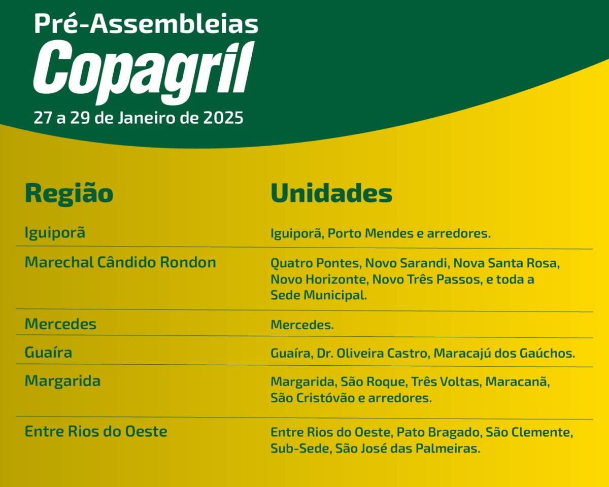 A partir da próxima segunda-feira (27) a Cooperativa Industrial Copagril iniciará o ciclo das pré-assembleias que antecedem a Assembleia Geral Ordinária (AGO) de 2025.