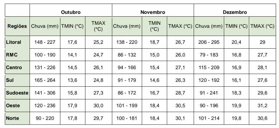 Valores médios históricos de chuva (faixa de variação), temperaturas do ar mínimas e máximas para cada região do Paraná nos meses de outubro, novembro e dezembro: