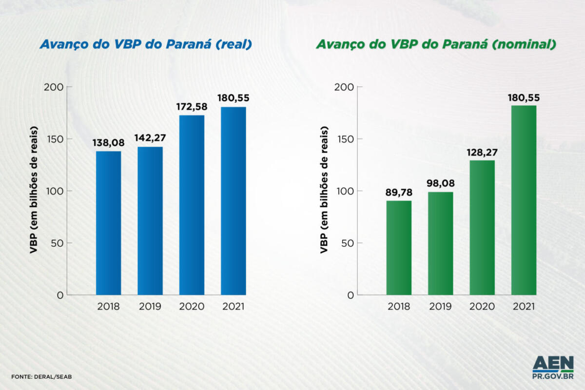 Em valores reais, que inclui o cálculo da inflação, o maior crescimento aconteceu em 2020 – até então, o maior VBP registrado no Paraná. O aumento foi de 21% em relação ao ano anterior. Ele saltou de R$ 142,27 bilhões, em 2019, para R$ 172,5 bilhões em 2020. Entre 2018 e 2019 o avanço foi de 3%, passando de R$ 138 bilhões para R$ 142,2 bilhões. Em 2021, a produção agropecuária paranaense teve aumento de 4,6% ante 2020, alcançando o recorde de R$ 180,6 bilhões de VBP.
