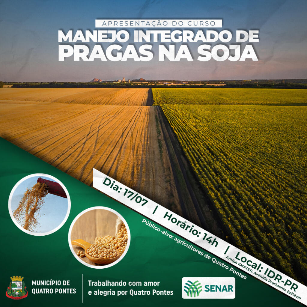 Para divulgar essa tecnologia aos agricultores de Quatro Pontes, a equipe do SENAR-PR apresentará o curso de MIP na segunda-feira (17), às 14 horas, no IDR-PR (antiga Emater). Neste mesmo local, os interessados podem se inscrever com Luis ou Marcia. O curso tem o objetivo de formar profissionais capazes de conduzir uma lavoura de soja de acordo com o protocolo técnico da Embrapa. Ou seja, a capacitação permite identificar os diferentes tipos de insetos e calcular o potencial de dano econômico para saber quando é o momento certo de aplicar o defensivo agrícola.