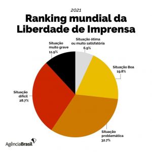 O Brasil ocupa a 111º colocação no Ranking Mundial de Liberdade de Imprensa 2021, segundo relatório divulgado ontem (20) pela organização não governamental Repórteres sem Fronteiras (RSF). A lista reúne 180 países e territórios. A Noruega, a Finlândia e a Suécia aparecem em primeiro, segundo e terceiro lugares, respectivamente. O Turcomenistão (178º), a Coreia do Norte (179º), no continente asiático, e a Eritreia (180º), na África, ocupam as últimas posições.