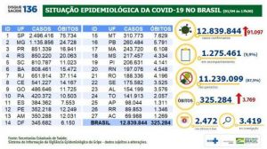 O Brasil chegou na quinta-feira (1º) a 325.284 mortes causadas pela Covid-19. Nas últimas 24 horas, foram registrados 3.769 óbitos. Foi o terceiro maior resultado depois dos de ontem (3.869) e anteontem (3.780), e o terceiro dia seguido com totais acima de 3.700 casos. Na quarta-feira (31), o total de vidas perdidas pela pandemia era de 321.515 óbitos.