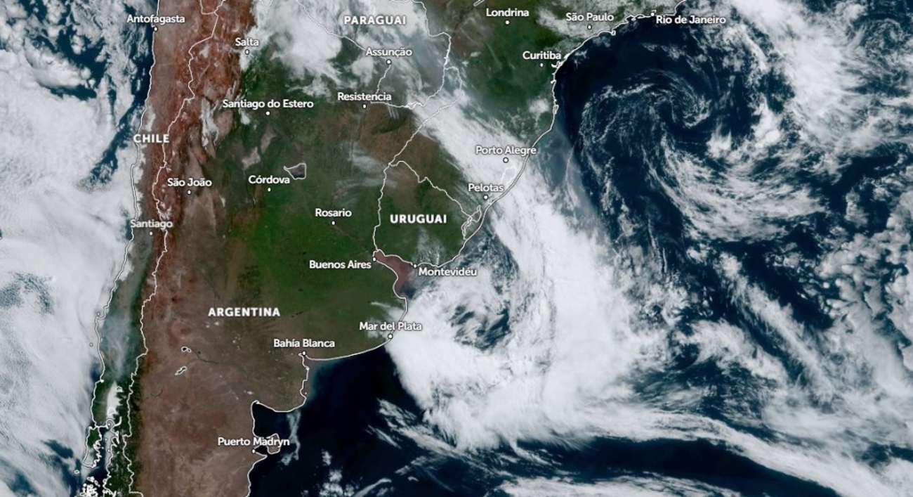 Ciclone extratropical na costa do Uruguai impulsiona ar mais frio para o Sul do Brasil neste começo de semana com temperatura agradável para esta época do ano. A imagem de satélite da manhã deste domingo mostrava o ciclone sobre o Oceano Atlântico junto ao litoral uruguaio e a frente fria associada ao sistema avançando pelo Rio Grande do Sul.