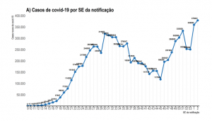 Com isso, a curva de casos da pandemia traz um patamar maior do que no meio de 2020, quando o pico chegou a 319.653 na semana epidemiológica 30, entre 19 e 25 de julho.